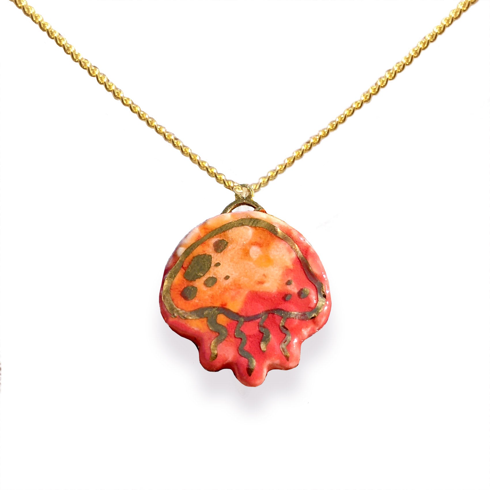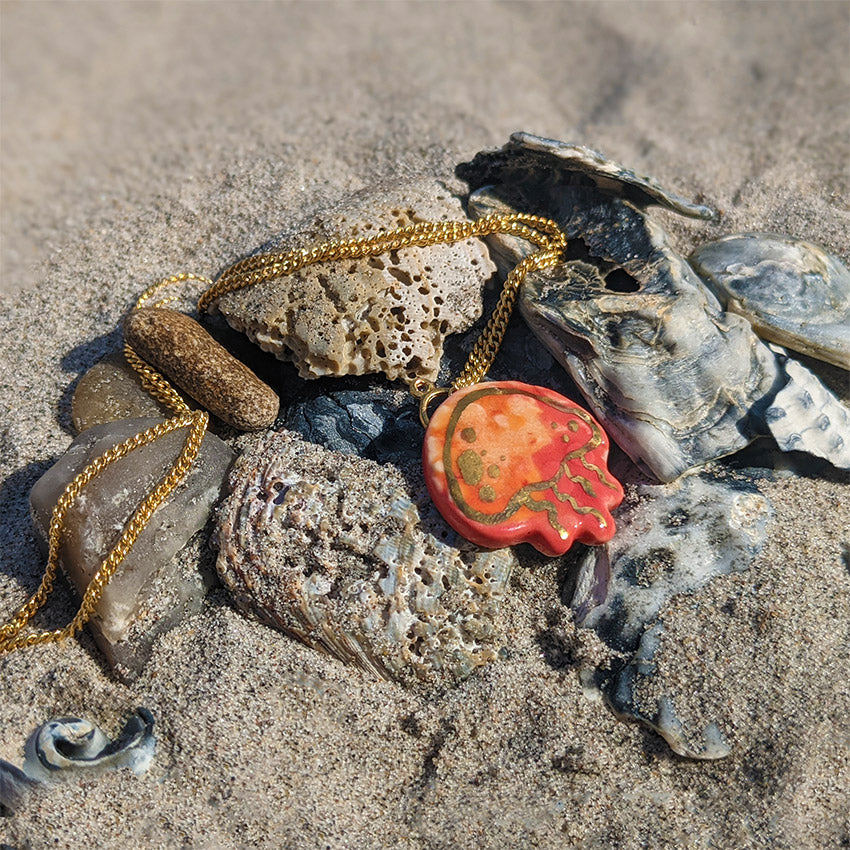 fired porcelain clay, glaze, resin, luster overglaze (optional), 16" brass chain