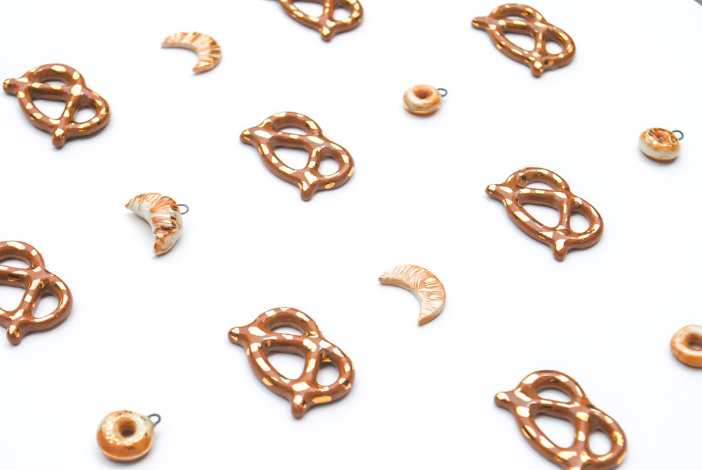These super small pretzels are handmade and painted with real 22k gold luster "salt"