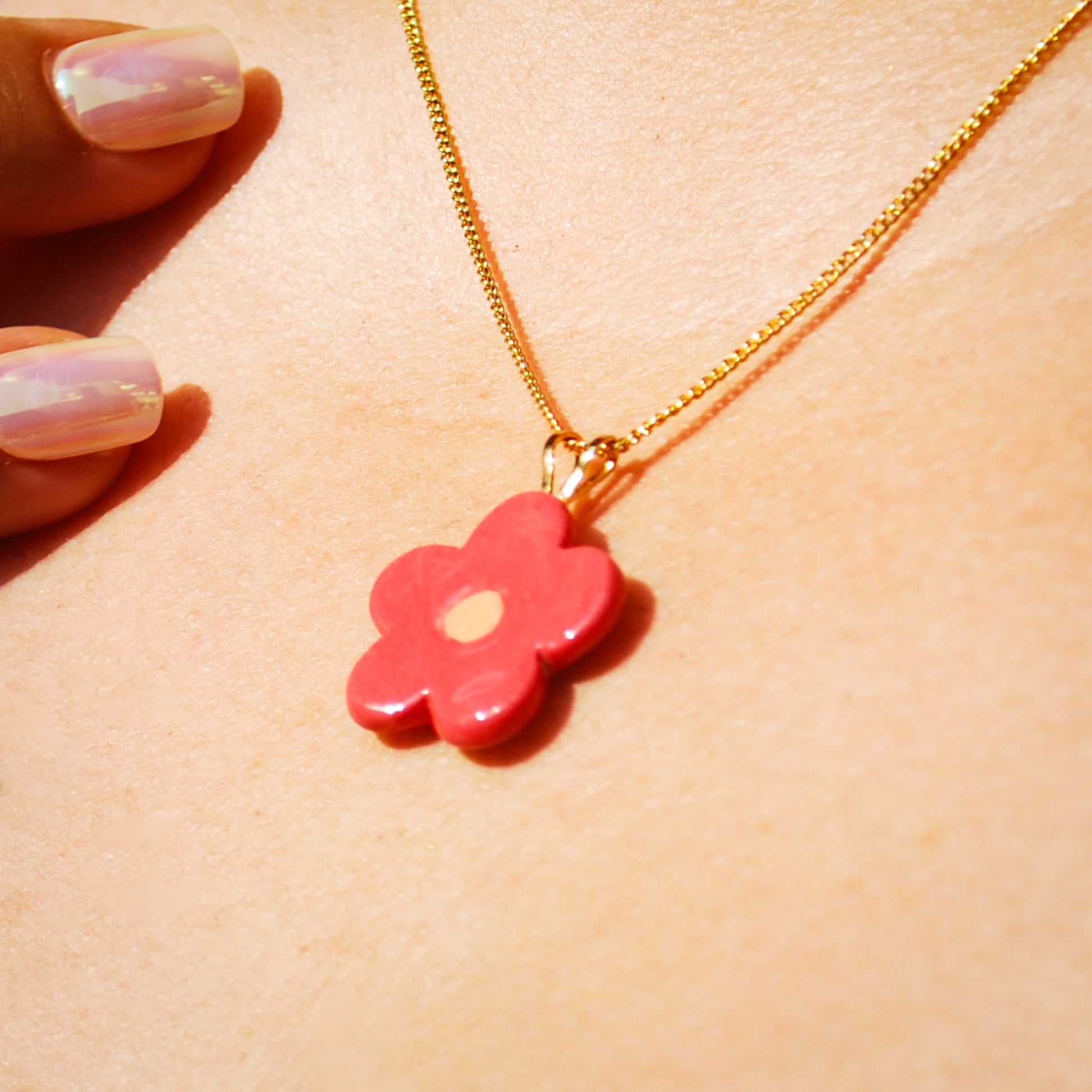fired porcelain clay, glaze, resin, luster overglaze (optional), 16" gold-plated brass chain